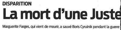 La famille des Justes porte le deuil de Marguerite Farges Titre de Sud Ouest (DR). Le procès Papon connut de multiples moments forts. Mais le 6 février 1998, devant un accusé égal à sa suffisance et à son absence totale de remords, le témoignage d'Yvette Moch apprit à beaucoup l'incroyable sauvetage d'un garçon de 6 ans. Ce dernier avait été dénoncé et enfermé sous bonne garde avec un peu plus de 200 autres juifs dans la synagogue de Bordeaux. Avant un transfert sur Drancy. Yvette Moch :- "Il y avait un nouveau-né (1), ç'a été un des plus beaux [...]
