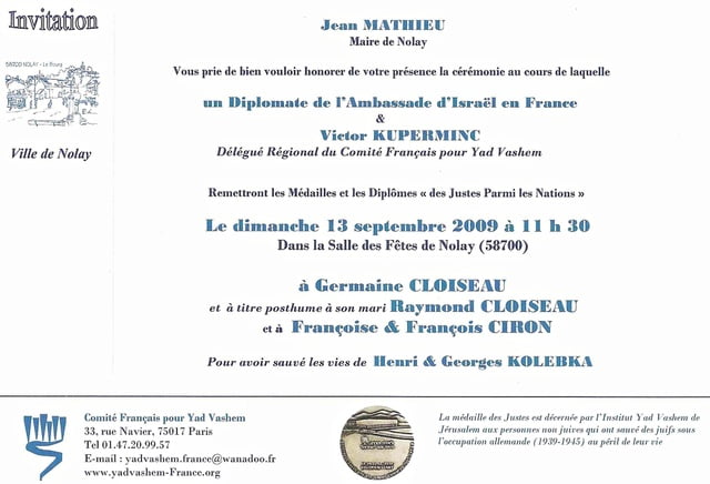 Raymond et Germaine Cloiseau - François et Françoise Ciron Invitation à la cérémonie du 13 septembre 2009 à Nolay (Arch. V. Kuperminc / DR). Le sauvetage en Nivernais d'Henri et de Georges Kolebka Organisée par Victor Kuperminc, délégué du Comité Français pour Yad Vashem, une émouvante cérémonie s'est tenue dans la Salle des fêtes de la ville de Nolay. Trois Justes parmi les Nations ont été honorés à titre posthume : Raymond Cloiseau ainsi que les époux Ciron, François et Françoise.Une quatrième Juste, Germaine Cloiseau a reçu sa médaille et son diplôme des mains de Shlomo Morgan, ministre conseiller à [...]