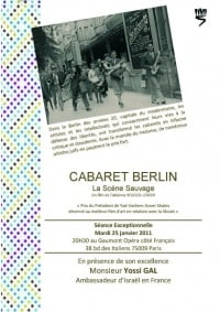 Cabaret Berlin A l’occasion de la 6e "Journée internationale de la Shoah" nous organisons une séance spéciale du film "Cabaret-Berlin ; la scène sauvage", Mardi 25 janvier 2011, à 20h30 au cinéma Gaumont Opéra,  côté Capucines, 2 Bd des Capucines, 75009 Paris.       Ce film a reçu le "Prix du Président de Yad Vashem Avner Shalev décerné au meilleur film d’art en relation avec la Shoah", au 27e Festival international du film de Jérusalem. Fidèles soutiens à Yad Vashem et gardiens de la mémoire de la Shoah, nous serons très heureux de vous retrouver pour cette soirée exceptionnelle du [...]