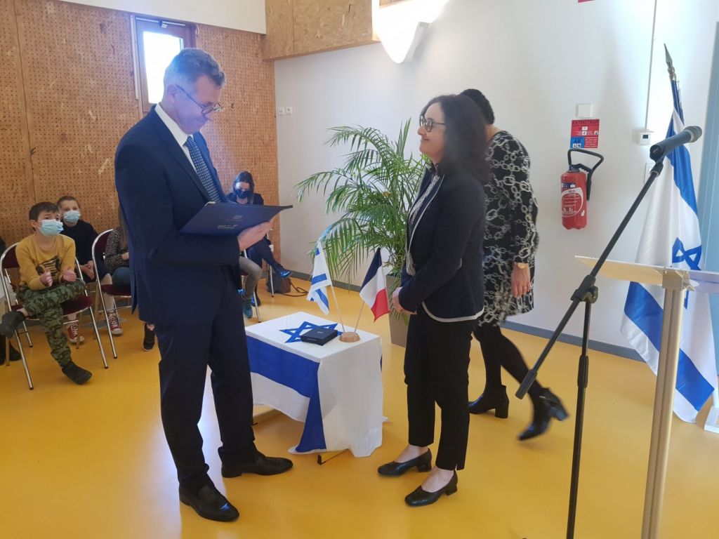 Madame Delphine Gamburg Ministre Conseiller – directrice de la communication  a remis la médaille des justes à Pierre-Olivier Reymond petit-fils d’Eric.